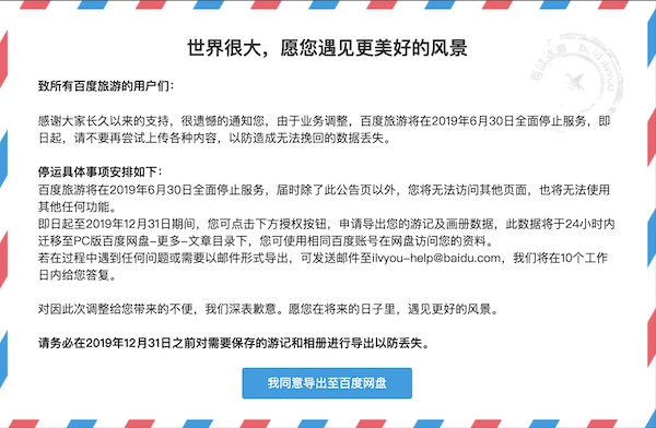 宣告,因为事务调整,将在 2019 年 6 月 30 日全面中止服务。“请不要再测验上传各种内容,以防形成无法挽回的数据丢掉。”百度旅行表明。依据公告,到时除了该公告页面以外,用户将无法拜访其他页面,也将无法运用其他任何功用。本日起至 2019 年 12 月 31 日期间,用户可点击公告页面下方的授权按钮,请求导出行记及画册数据,相关数据将于 24 小时内迁移至 PC 版百度网盘-更多-文章目录下,可运用相同百度账号在网盘拜访材料。
