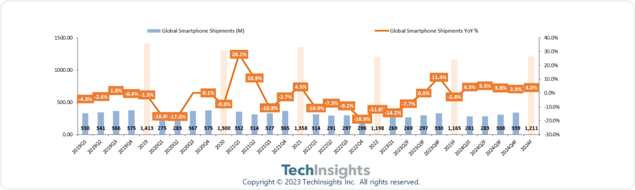 TechInsights:2023 年全球智能手机出货量同比下降 3%